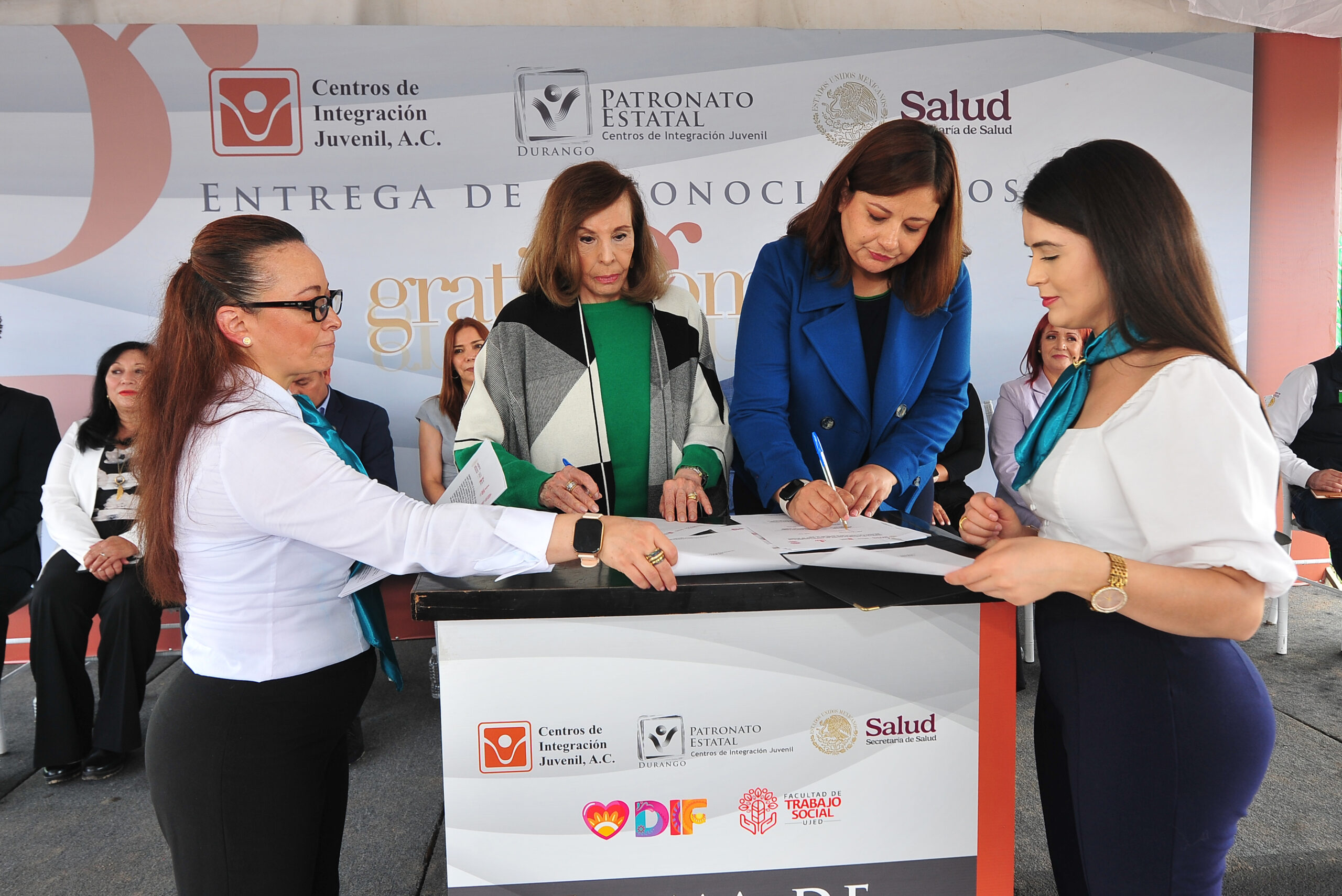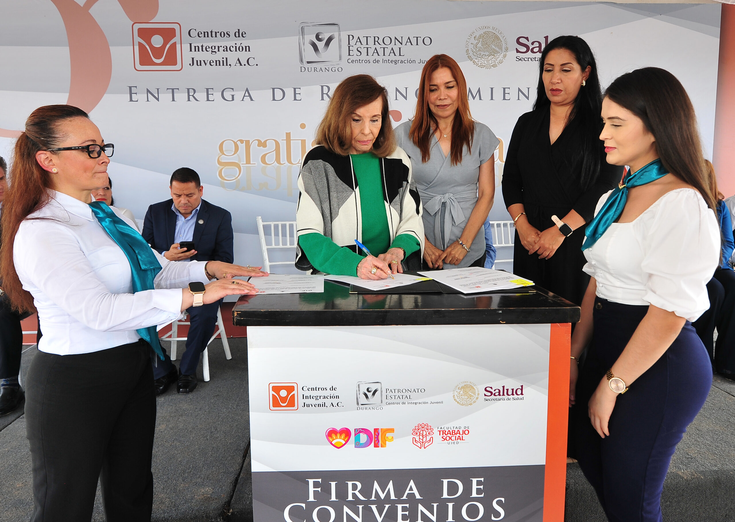 Durante el acto protocolario, se realizó la firma de convenios de colaboración interinstitucional entre el CIJ y dos importantes entidades del estado. El primero de ellos, con el Sistema DIF Estatal Durango, contó con la presencia de la Mtra. Martha Elia Muñoz Martínez, Directora General del DIF Estatal. El segundo, con la Facultad de Trabajo Social de la UJED, fue encabezado por la Dra. Ana Rosa Rodríguez Durán, Directora de dicha facultad.
